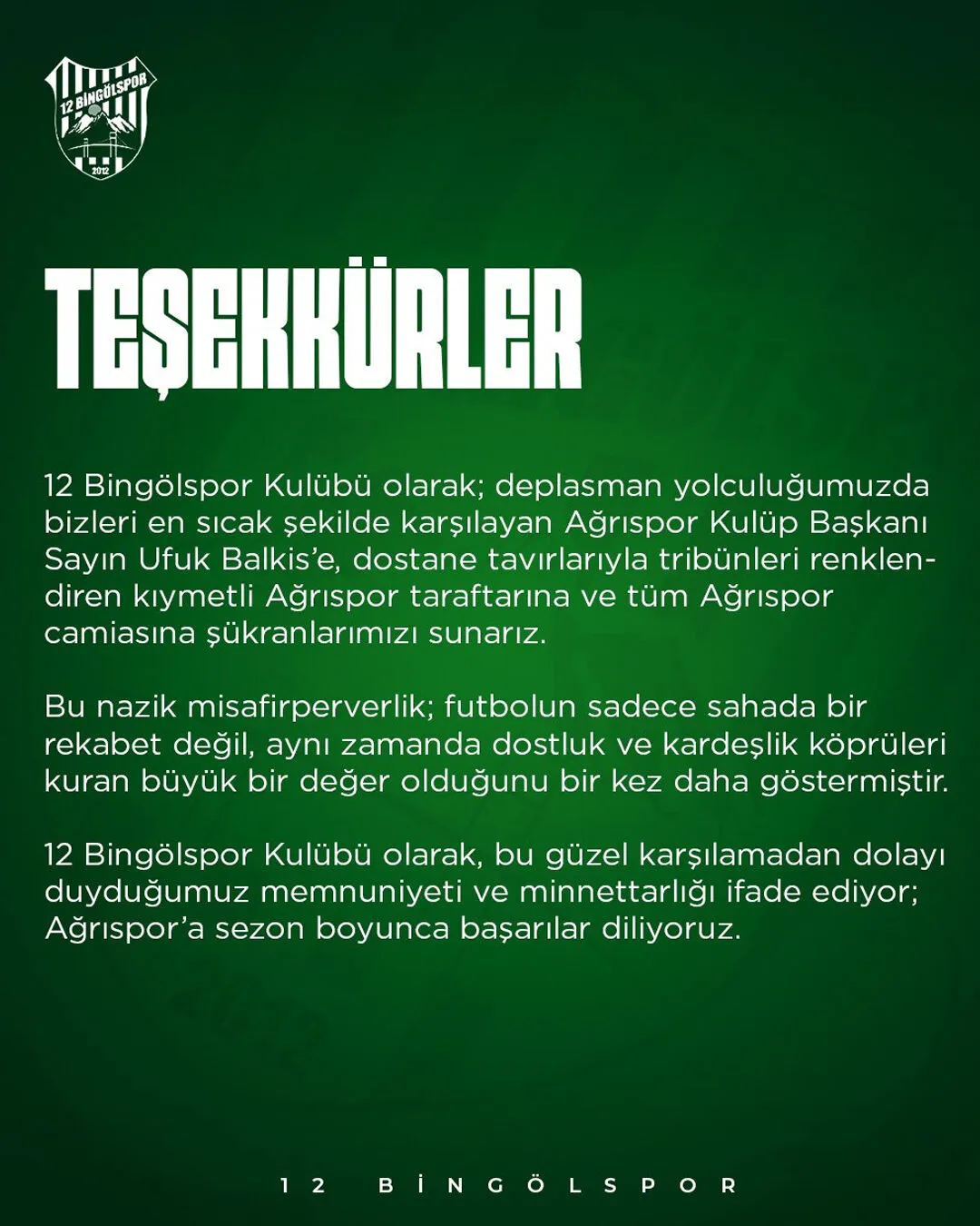 3.Lig 2. Grup’ta namağlup liderliğini sürdüren 12 Bingölspor, Ağrı deplasmanındaki misafirperverliklerinden dolayı Ağrı 1970 Spor ve Ağrıspor camiasına teşekkür etti.