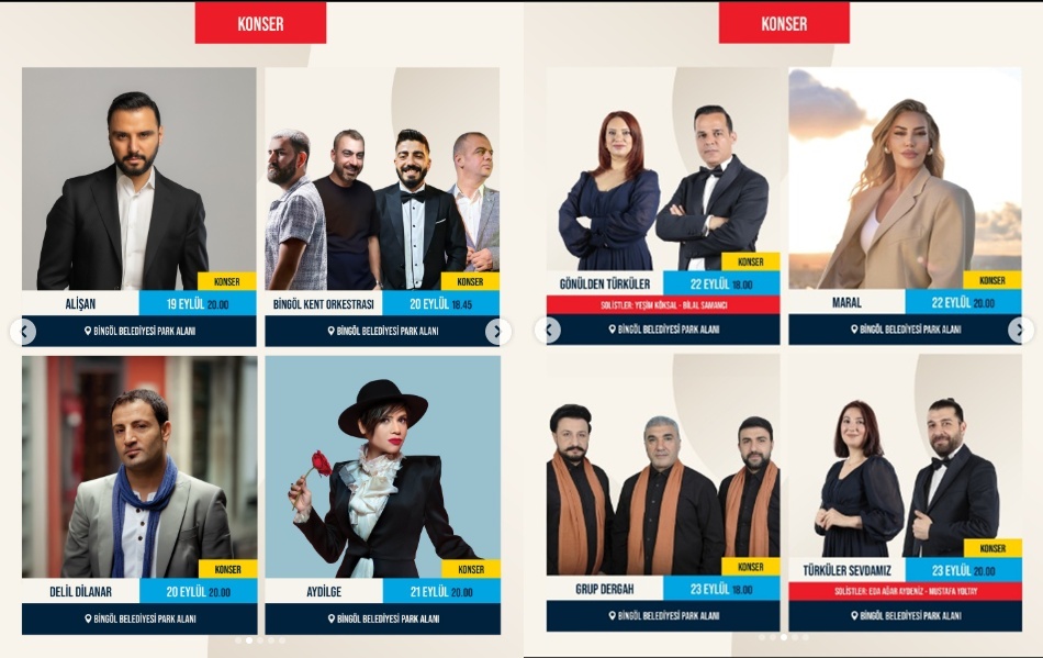 Etkinlikler, 19-25 Eylül tarihleri arasında devam edecek. Konserlerde Alişan, Bingöl Kent Orkestrası, Delil Dilaner, Aydilge, Gönülden Türküler, Maral, Grup Dergah ve Türküler Sevdamı sahne alacak.