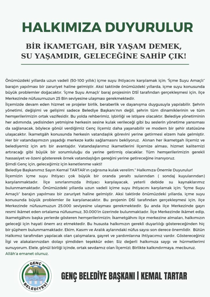 Genç ilçesinin geleceğini güvence altına almak adına tüm hemşerilerini birlik ve beraberlik içinde hareket etmeye davet eden Başkan Tartar, “İlçemizin daha yaşanabilir bir yer haline gelmesi için hepimiz sorumluluk almalıyız. İkametgahını ilçe merkezine almayan vatandaşlarımızın bu konuda adım atması, ilçemizin geleceği için hayati önemdedir” dedi.