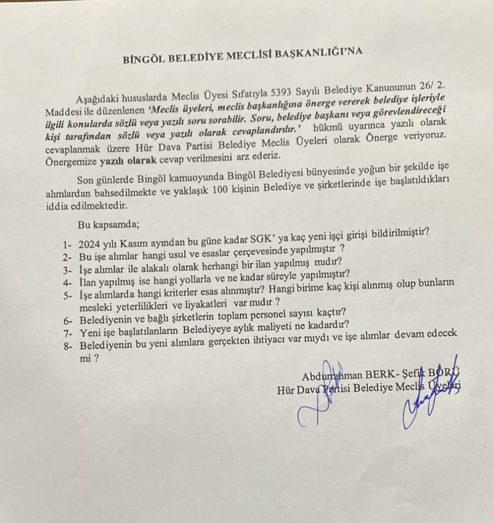 BİNGÖL GÜNCEL TV - Bingöl Belediyesi'nde son günlerde yaşanan yoğun işe alım süreci, Hür Dava Partisi (HÜDAPAR) Belediye Meclisi üyeleri Abdurahman Berk ve Şefik Börü tarafından meclise taşındı. Meclis üyeleri, belediyedeki işe alımlarla ilgili olarak belediye başkanlığına yazılı soru önergesi sundu. HÜDAPAR Meclis üyeleri, 5393 Sayılı Belediye Kanunu'nun 26. maddesine dayanarak belediye başkanından yazılı yanıt verilmesini talep etti.