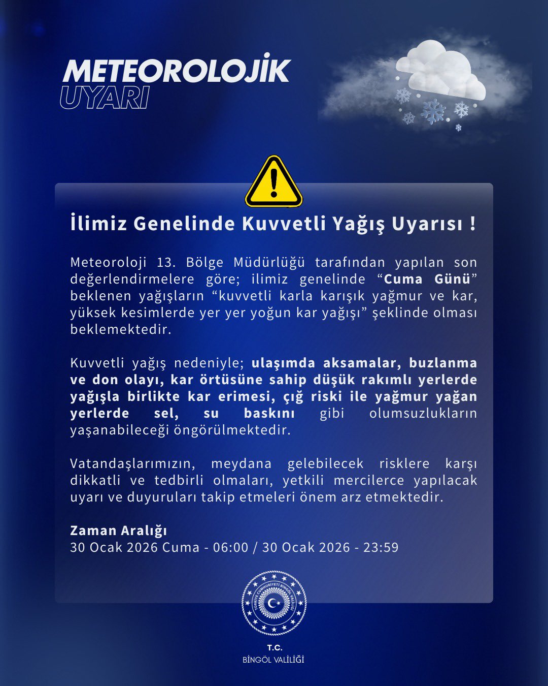Yetkililer, vatandaşların tedbirli olmaları, zorunlu olmadıkça trafiğe çıkmamaları ve resmi kurumlar tarafından yapılacak uyarıları yakından takip etmeleri gerektiğini vurguladı.