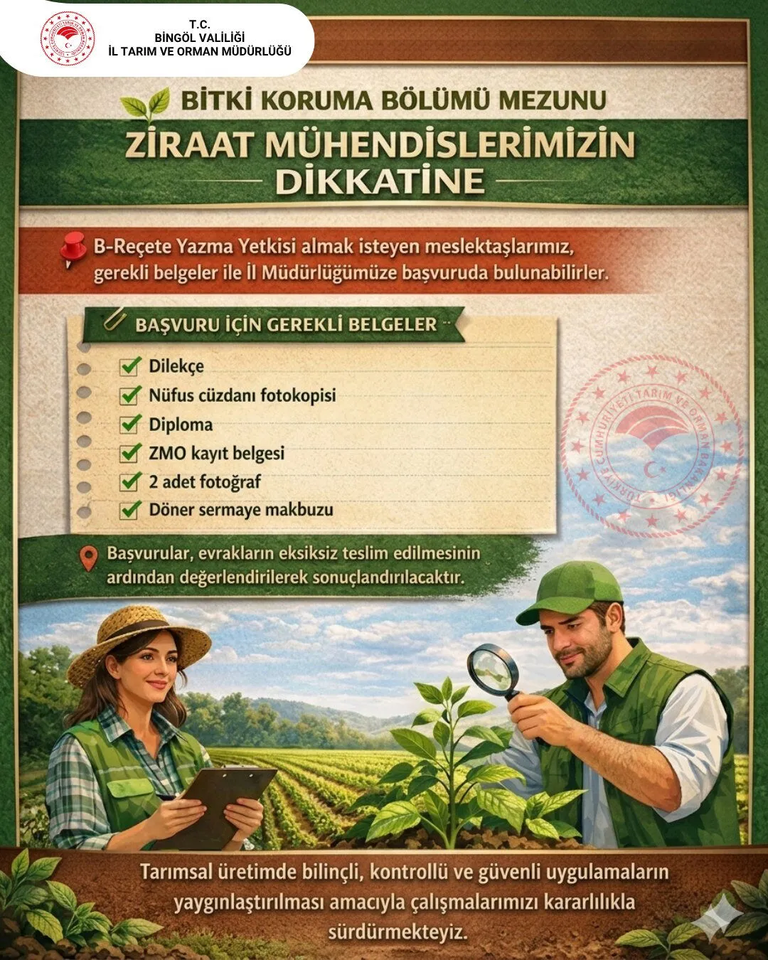 Bingöl İl Tarım ve Orman Müdürlüğü, bitki koruma alanında görev yapan ziraat mühendislerini ilgilendiren önemli bir duyuru yaptı. Yapılan açıklamada, B-Reçete Yazma Yetkisi almak isteyen Bitki Koruma Bölümü mezunu ziraat mühendisleri için başvuru sürecinin başladığı bildirildi.