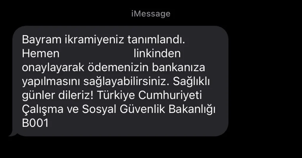 BİNGÖL GÜNCEL TV - Dolandırıcılar, emeklilere bayram ikramiyelerinin tanımlandığını belirten, "Çalışma ve Sosyal Güvenlik Bakanlığı" ibaresi taşıyan sahte SMS'ler gönderiyor. Bu mesajlarla birlikte, vatandaşların cep telefonlarına sızarak kişisel veri ve banka hesap bilgilerine erişmeye çalışıyorlar.