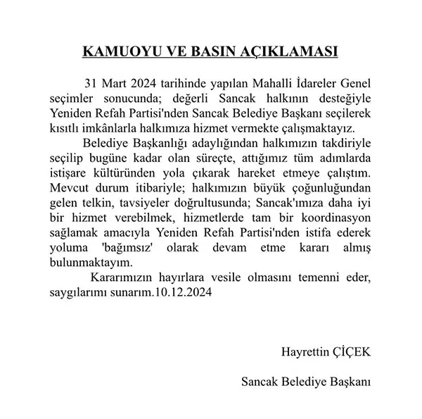 Mevcut durum itibariyle; halkımızın büyük çoğunluğundan gelen telkin ve tavsiyeler doğrultusunda; Sancak'ımıza daha iyi bir hizmet verebilmek, hizmetlerde tam bir koordinasyon sağlamak amacıyla Yeniden Refah Partisi'nden istifa ederek yoluma 'bağımsız' olarak devam etme kararı almış bulunmaktayım. Kararımızın hayırlara vesile olmasını temenni eder, saygılar sunarım." [BGHA]