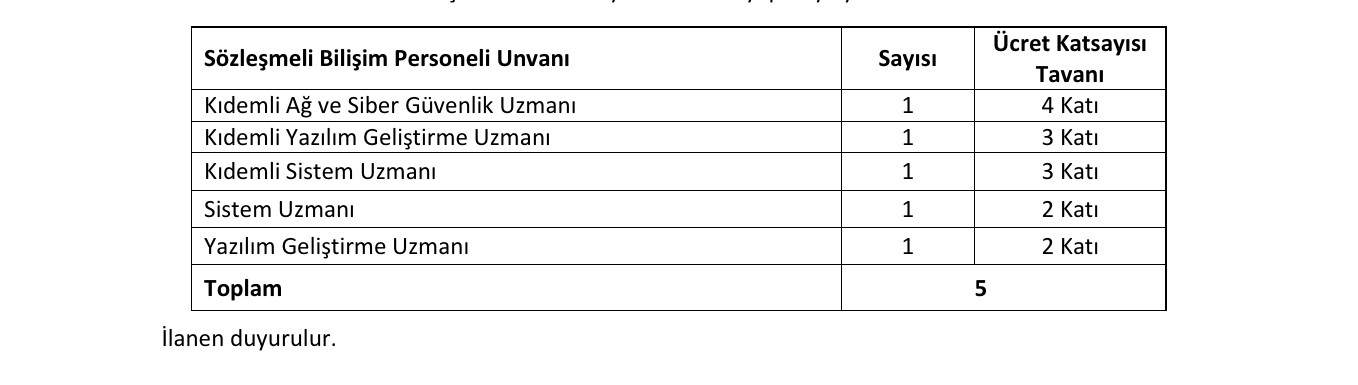 - Kıdemli Ağ ve Siber Güvenlik Uzmanı (1 kişi): En az 7 yıl ağ ve siber güvenlik operasyonlarında tecrübe, CISSP sertifikası ve en az 5000 aktif kullanıcıya sahip bir bilgi işlem merkezinde deneyim.