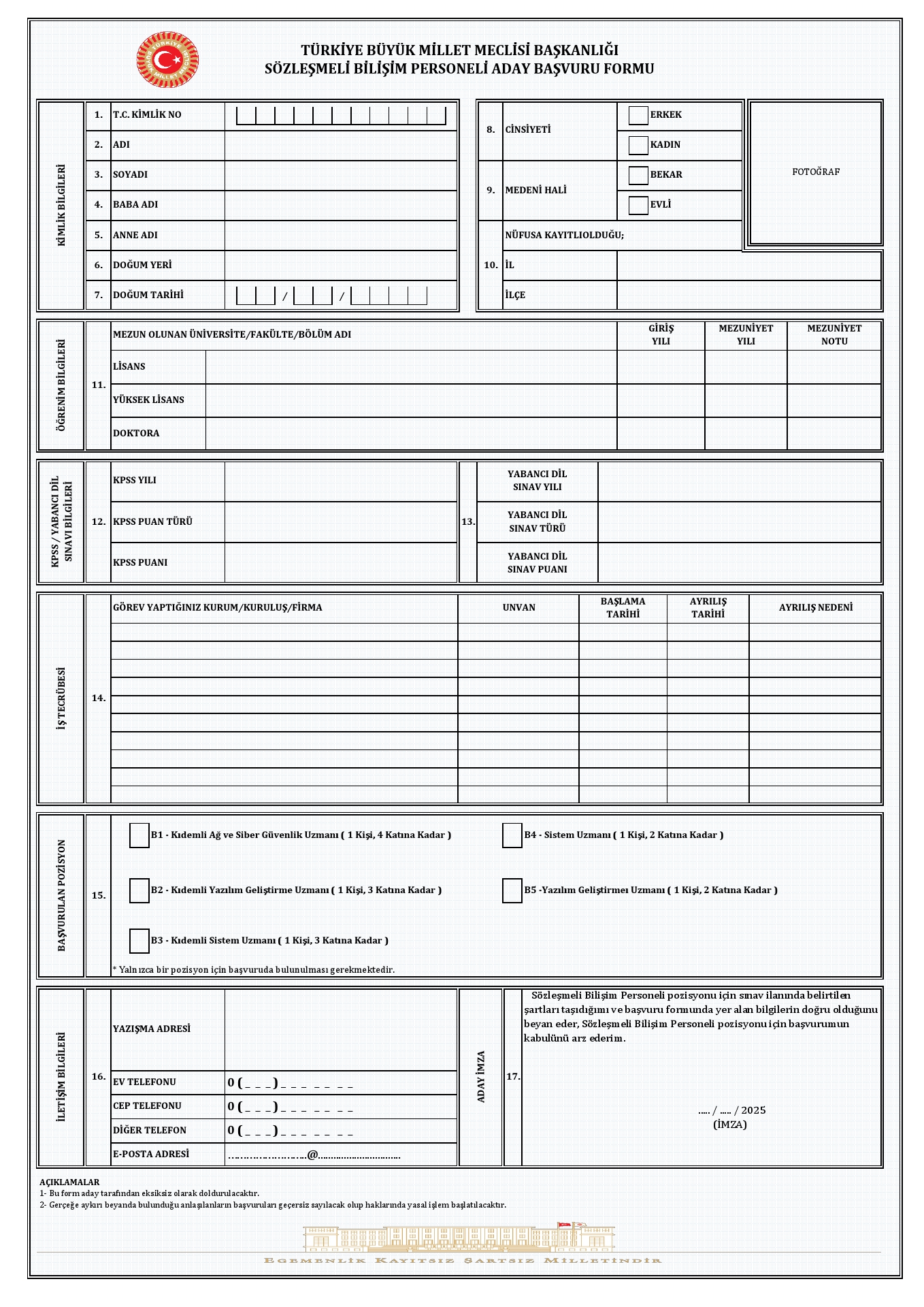 - Posta ile başvurular: TBMM İnsan Kaynakları Başkanlığı Kavaklıdere Mahallesi Zeytindalı Caddesi No:2 Bakanlıklar/ANKARA adresine.