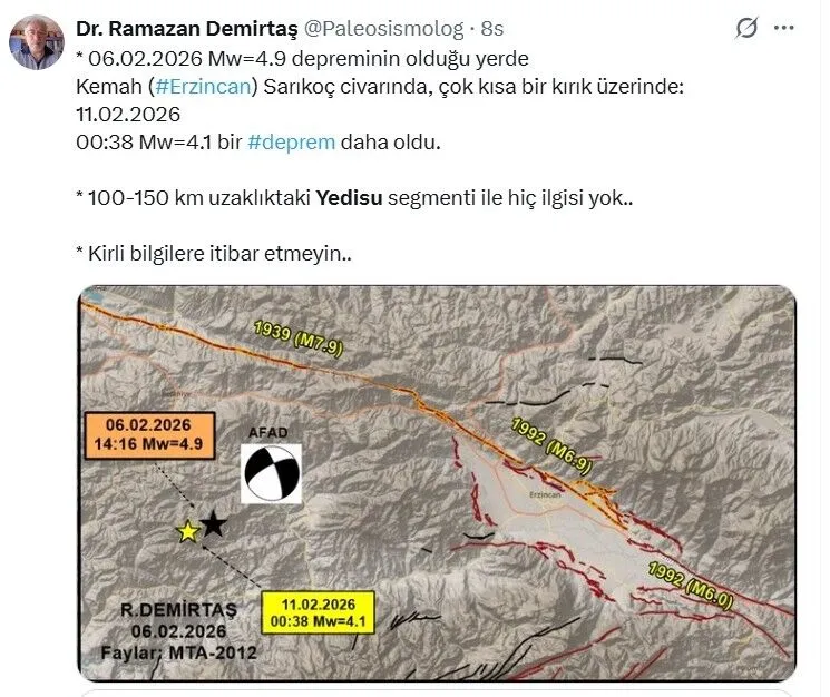Öte yandan Deprem Jeolojisi Uzmanı D. Ramazan Demirtaş ise farklı bir görüş dile getirdi. Demirtaş, Kemah’ta meydana gelen depremin Sarıkoç civarında, kısa bir kırık üzerinde oluştuğunu belirterek, bu sarsıntının Yedisu segmentiyle doğrudan bir bağlantısının bulunmadığını ifade etti. Yedisu segmentinin yaklaşık 100–150 kilometre uzaklıkta olduğuna dikkat çeken Demirtaş, depremin yerel bir faylanma sonucu meydana geldiğini kaydetti.